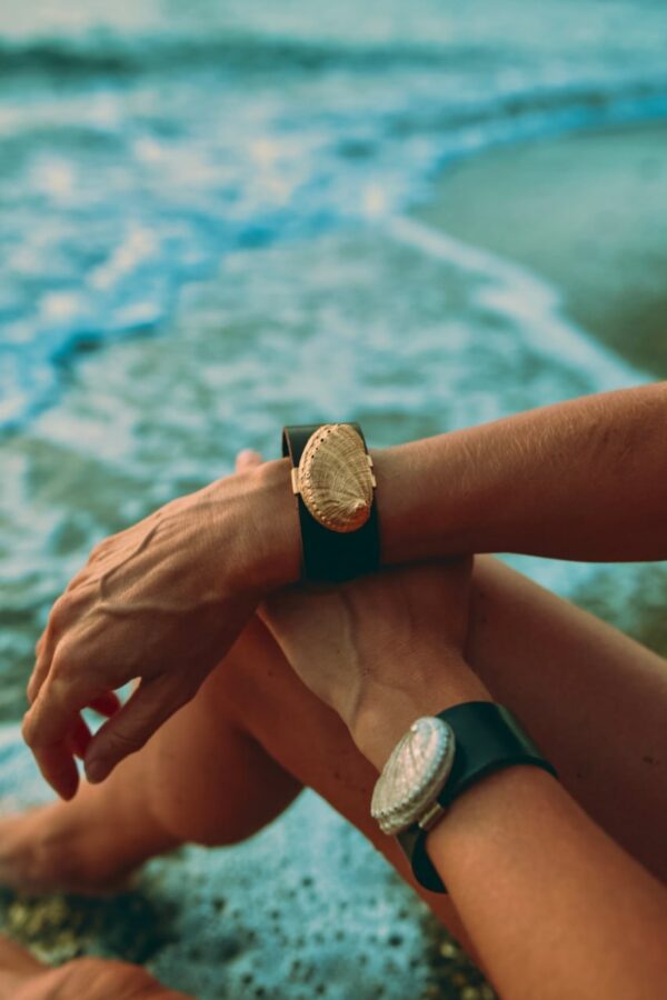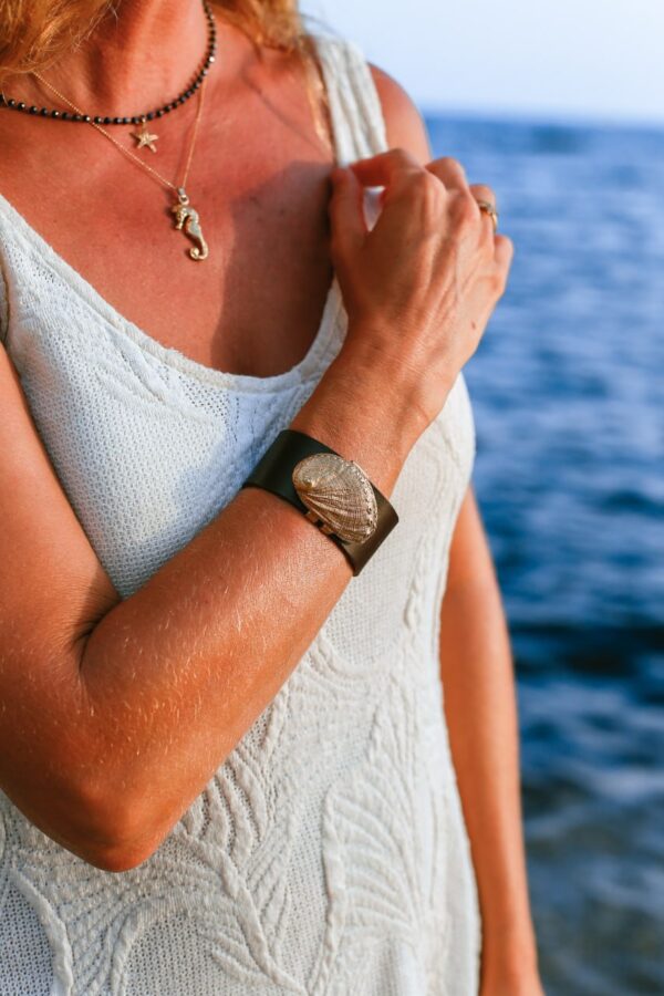 Brazalete con oreja de mar en plata con baño de oro, sobre cuero. Intuición y escucha interior.