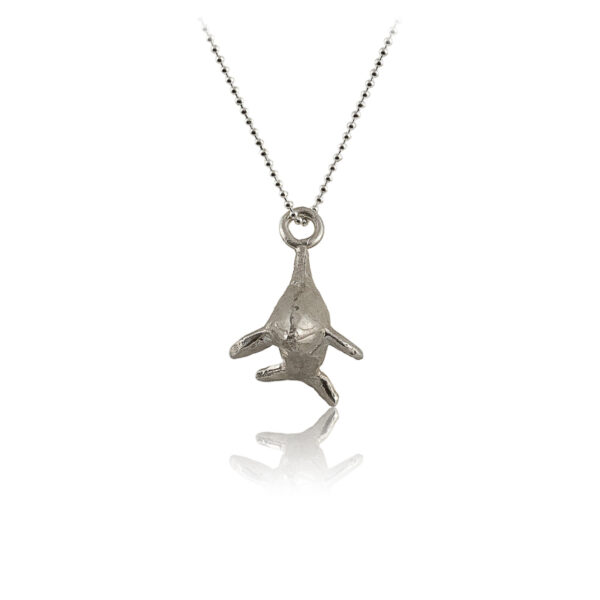 Este colgante está compuesto por una orca de plata que mide 2,5 cm de largo por 1,5 cm de ancho. Incluye cadena de plata de 40 cm.