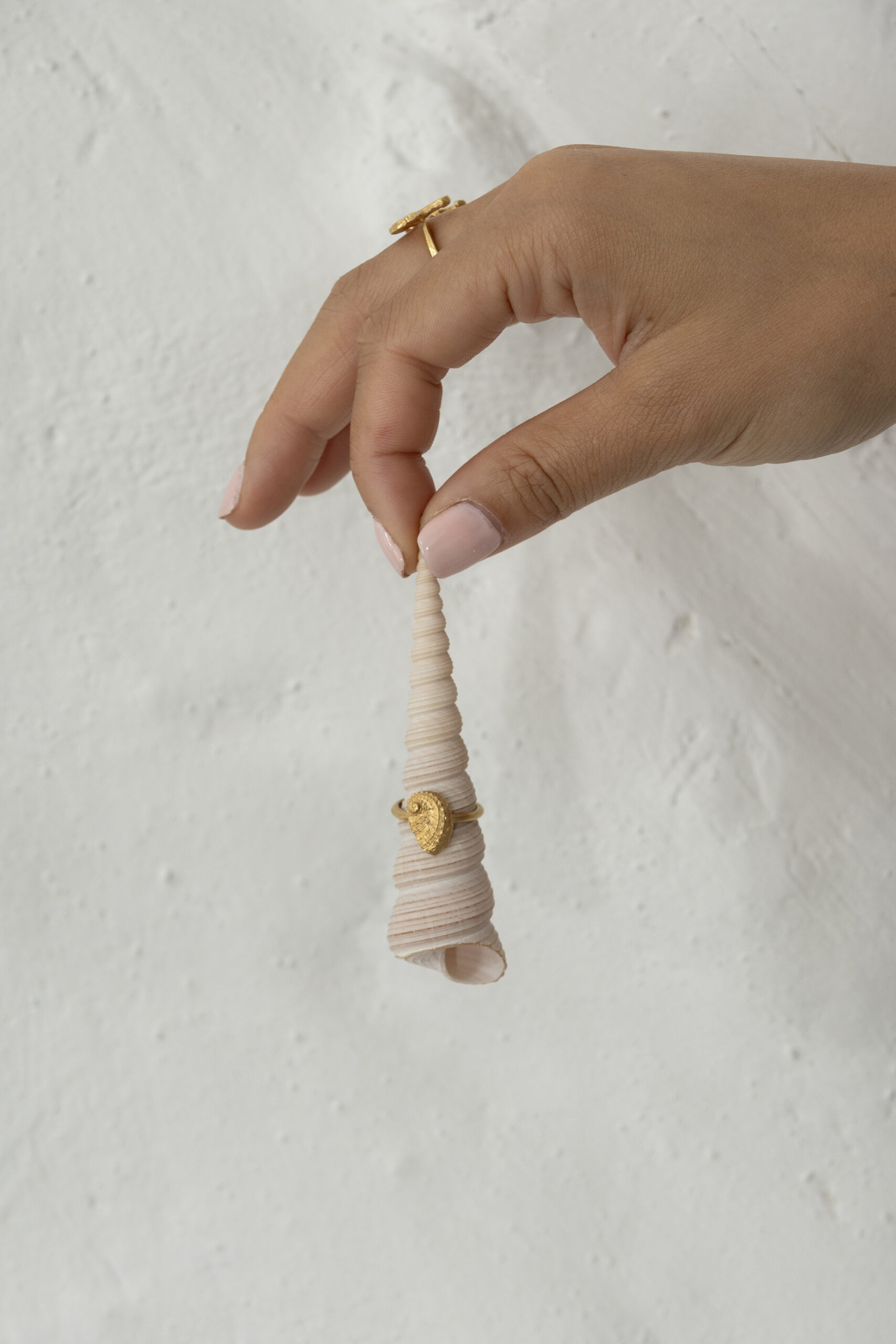 Este anillo, inspirado en una oreja de mar, nos invita a escuchar lo sutil: la voz de la intuición, los silencios del alma y todo aquello que se esconde bajo la superficie. Llevar esta joya nos invita a poner atención en la importancia de mirarnos hacia adentro y conectar con lo que de verdad nos mueve.