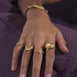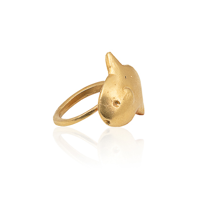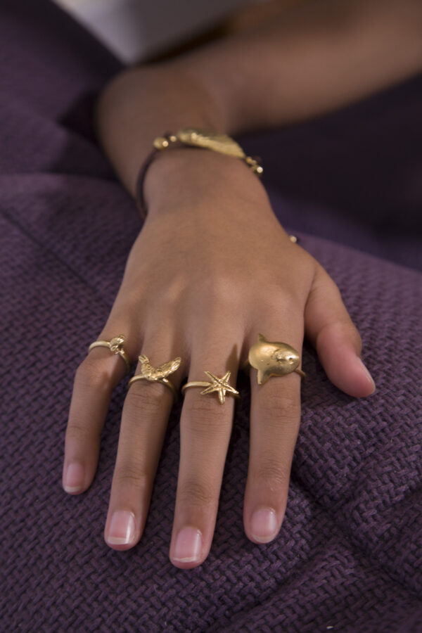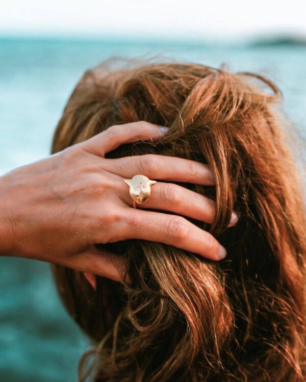 Este anillo está compuesto por un pez luna de plata con baño de oro de 24 quilates. Mide 2 x 2,5 cm. Anillo ajustable.