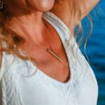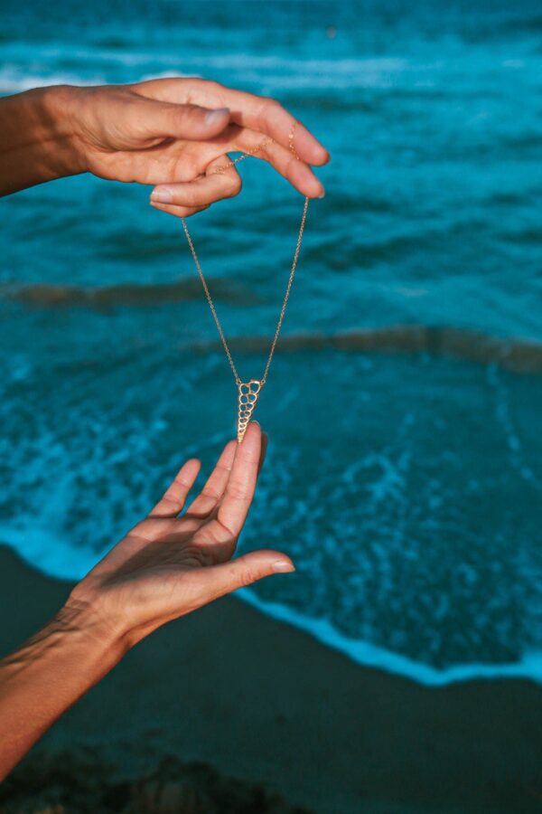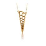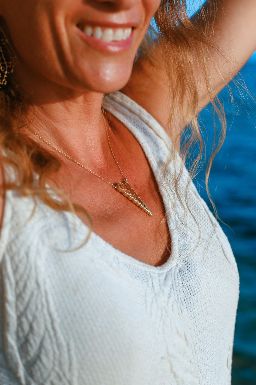 Este colgante está compuesto por una caracola partida a la mitad de plata con baño de oro de 24 quilates, con su estructura calada que muestra la espiral interior. Mide 4 cm de alto por 2 cm de ancho. Incluye cadena de plata bañada en oro de 40 cm.
