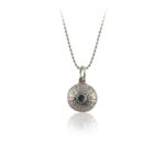 Tiene un tamaño de 1cm y una circonita aguamarina engastada en su centro. Lleva una cadena de plata de 40cm. Diseño exclusivo de la colección ¨Mis tesoros del mar¨. Fabricado a mano en plata. Ideal para regalo o para quienes buscan una joya especial.