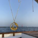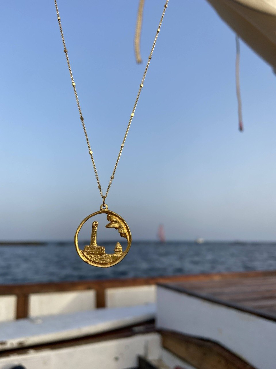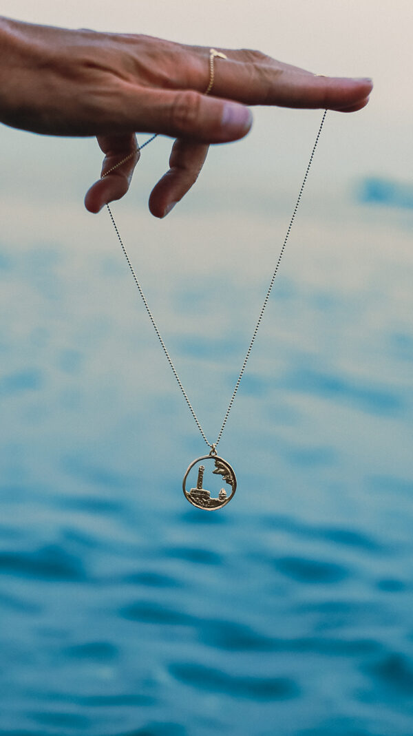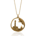 Este colgante está inspirado en el Faro de Cabo de Palos y mide 2,5 cm, realizado en plata con baño de oro de 24 quilates. Incluye cadena de plata bañada en oro de 40 cm.