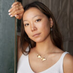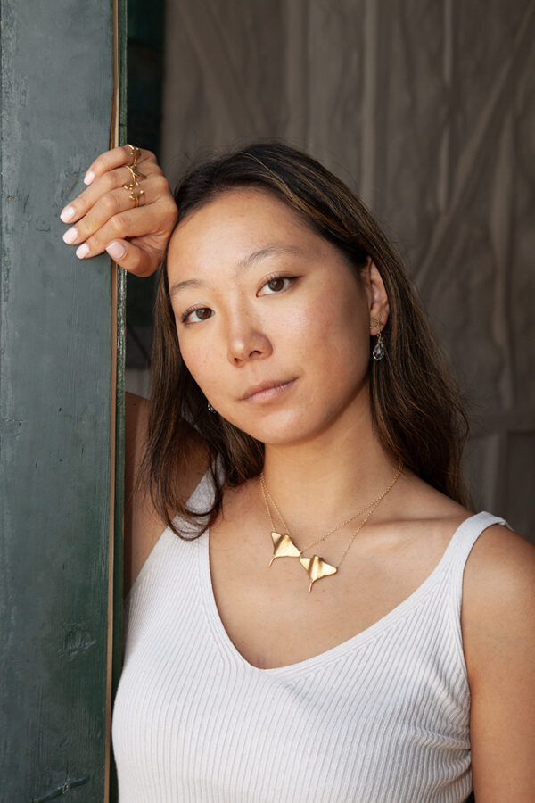 Este colgante está compuesto por una mantarraya de plata con baño de oro de 24 quilates que mide 3 x 3 cm. La mantarraya se sujeta por una cadena de plata bañada en oro que sale de cada ala, con una longitud de 40 cm.