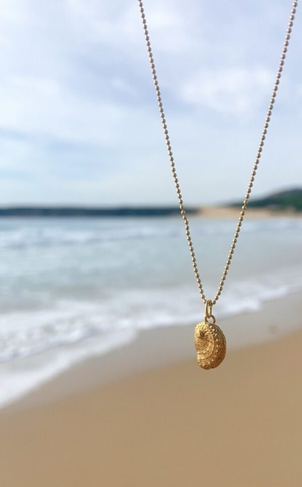 Este colgante está compuesto por una oreja de mar de plata con baño de oro de 24 quilates que mide 1 cm. Incluye cadena de plata bañada en oro de 40 cm.