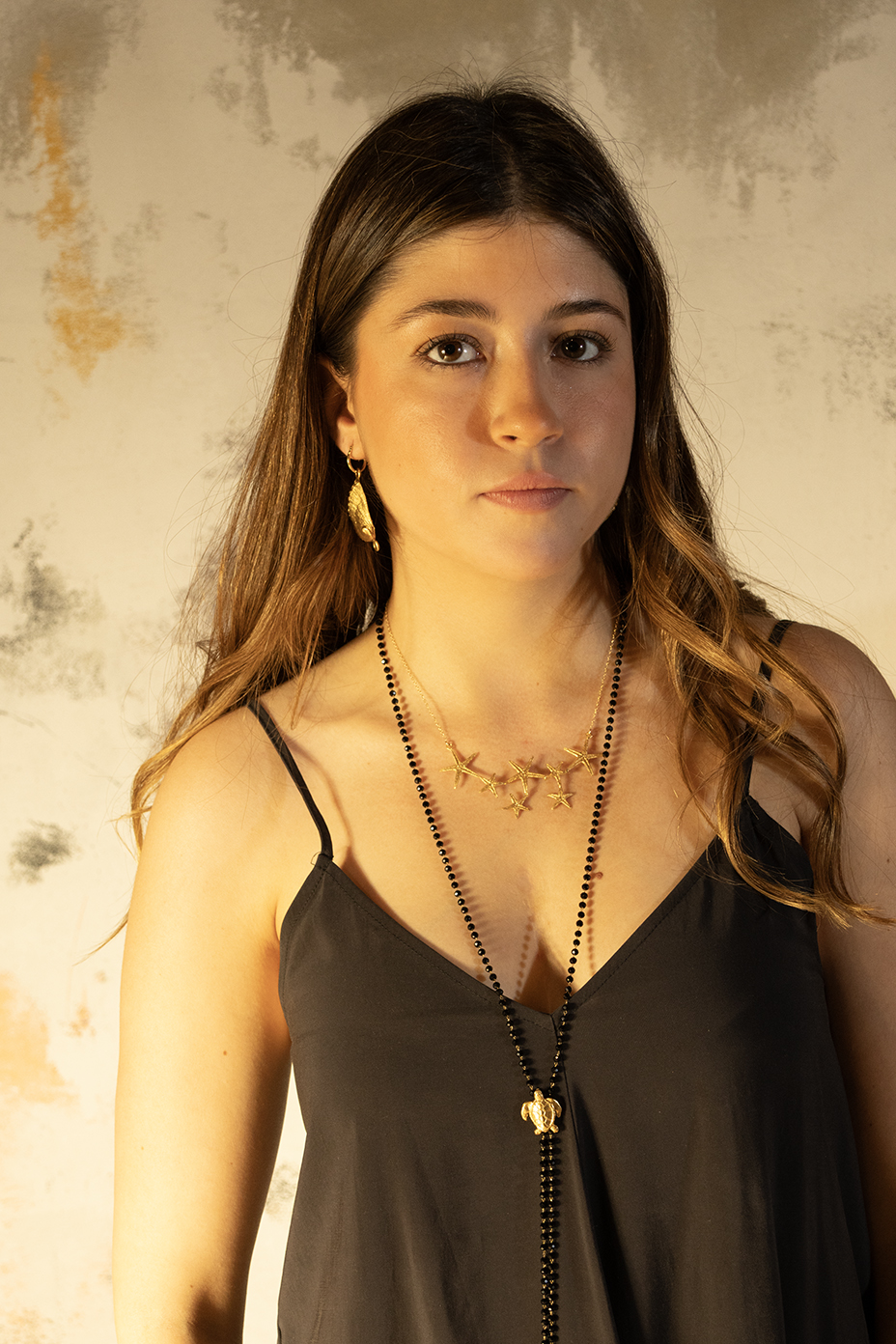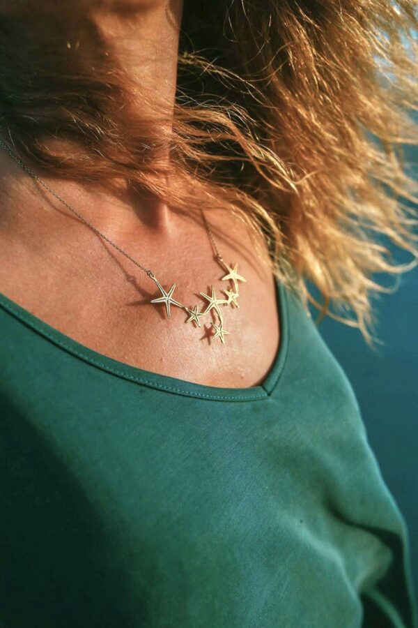 Esta gargantilla está compuesta por 7 estrellas de mar de dos tamaños diferentes, distribuidas como una constelación del mar. Cada estrella está realizada en plata mediante microfusión y tiene un baño de oro de 18ql. Mide 9 cm de ancho x 4 cm de alto. La cadena es ajustable.