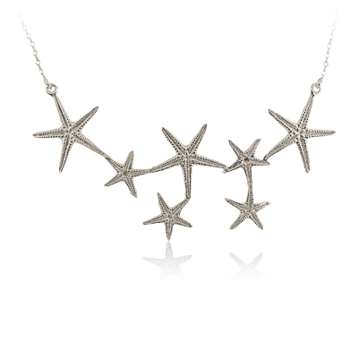 Esta gargantilla está compuesta por 7 estrellas de mar de dos tamaños diferentes, distribuidas como una constelación del mar. Cada estrella está realizada en plata por la técnica de microfusión. Mide 9 cm de ancho x 4 cm de alto. La cadena es ajustable.