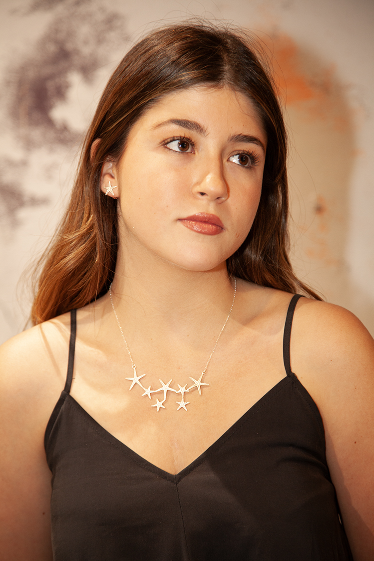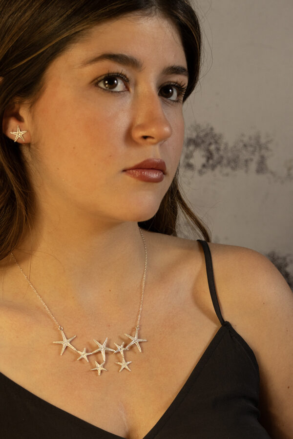 Esta gargantilla está compuesta por 7 estrellas de mar de dos tamaños diferentes, distribuidas como una constelación del mar. Cada estrella está realizada en plata por la técnica de microfusión. Mide 9 cm de ancho x 4 cm de alto. La cadena es ajustable.