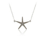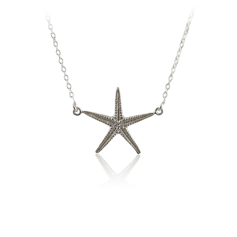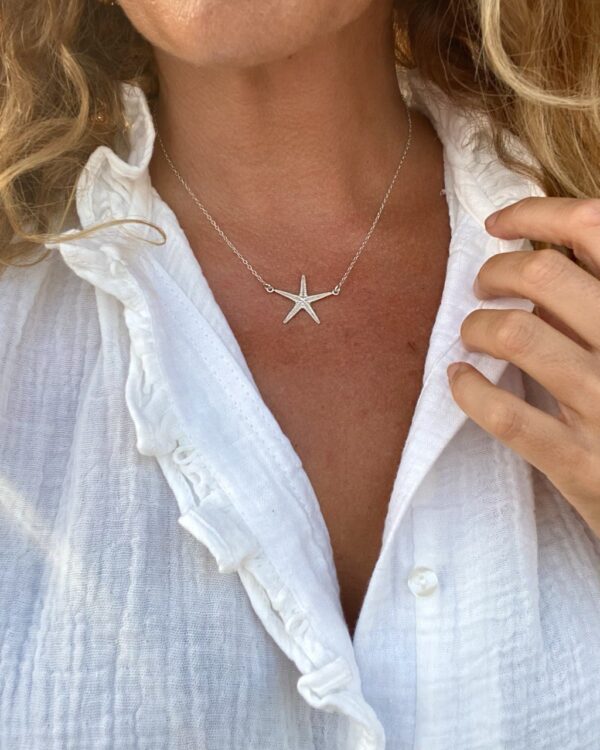 Esta gargantilla está compuesta por una estrella de mar de plata que mide 3,5 cm, sujeta directamente a una delicada cadena de plata por las patitas de cada lado.