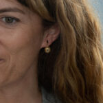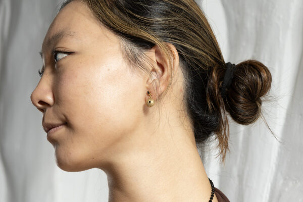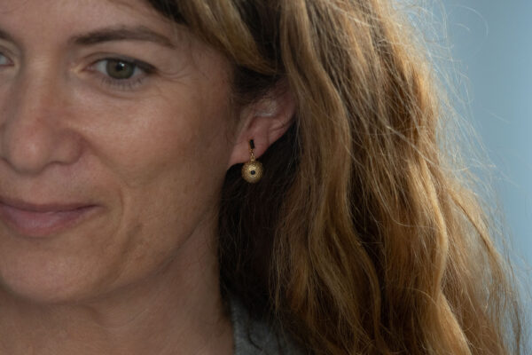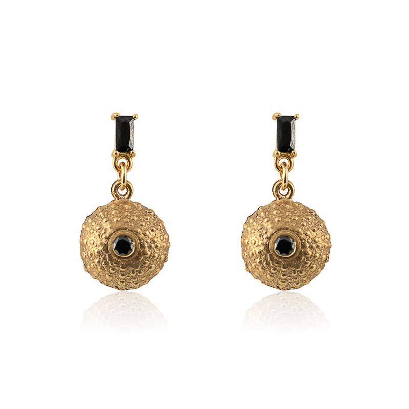 Estos pendientes están compuestos por un erizo de mar modelado en cera y fundido en plata con baño de oro de 18 quilates, con una circonita negra engastada en su centro. En la parte superior, una circonita negra facetada. El erizo mide 1 cm y el pendiente completo mide 1,5 cm. Cierre de presión en plata bañada en oro.
