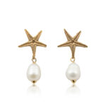 Estos pendientes están compuestos por una estrella de mar de plata con un baño de oro de 24 quilates.y una perla. Mide 1<jbjkbkb¡09ucm. Cierre de presión.