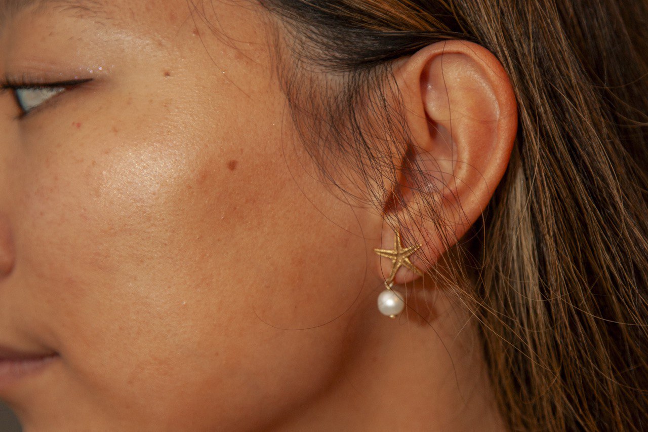 Estos pendientes están compuestos por una estrella de mar de plata con un baño de oro de 24 quilates.y una perla. Mide 1<jbjkbkb¡09ucm. Cierre de presión.
