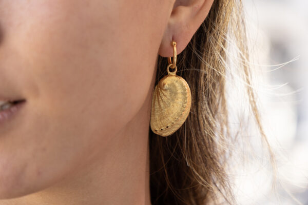 Estos pendientes están compuestos por una oreja de mar de plata con baño de oro de 18 quilates que cuelga de un aro. Mide 5,5 cm. Cierre de aro.