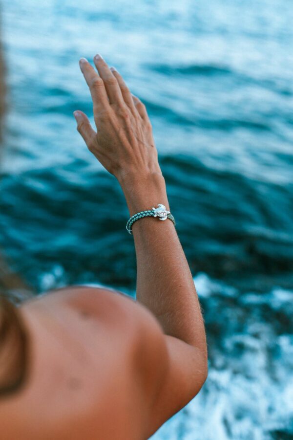Pulsera de tortuga marina en plata con cuero. Calma y sabiduría.
